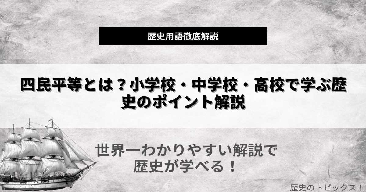 四民平等は、日本の歴史を学ぶうえで重要なキーワードの一つです。明治時代の大きな社会変革の中で導入されたこの制度は、江戸時代の厳しい身分制度を大きく変え、人々の暮らしや考え方に大きな影響を与えました。本記事では、小学校・中学校・高等学校での学びにあわせて四民平等の意味や背景、そして現代に続く意義まで、わかりやすく・深く解説します。歴史の流れや社会の変化を知る手がかりとして、四民平等について一緒に学んでいきましょう!