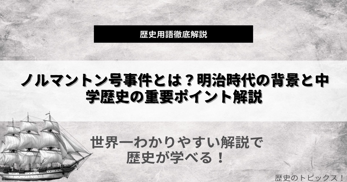 明治時代に起きたノルマントン号事件は、日本の近代化と深く関わる歴史的な出来事です。イギリス船の沈没事故をきっかけに、日本国内で不平等条約の見直しを求める声が一気に高まりました。この記事では、ノルマントン号事件の詳細や背景、さらにその後の条約改正に至るまでの流れを、中学歴史の学習内容を踏まえてわかりやすく解説します。事件のポイントや試験によく出る問題も紹介するので、しっかり理解しておきましょう!