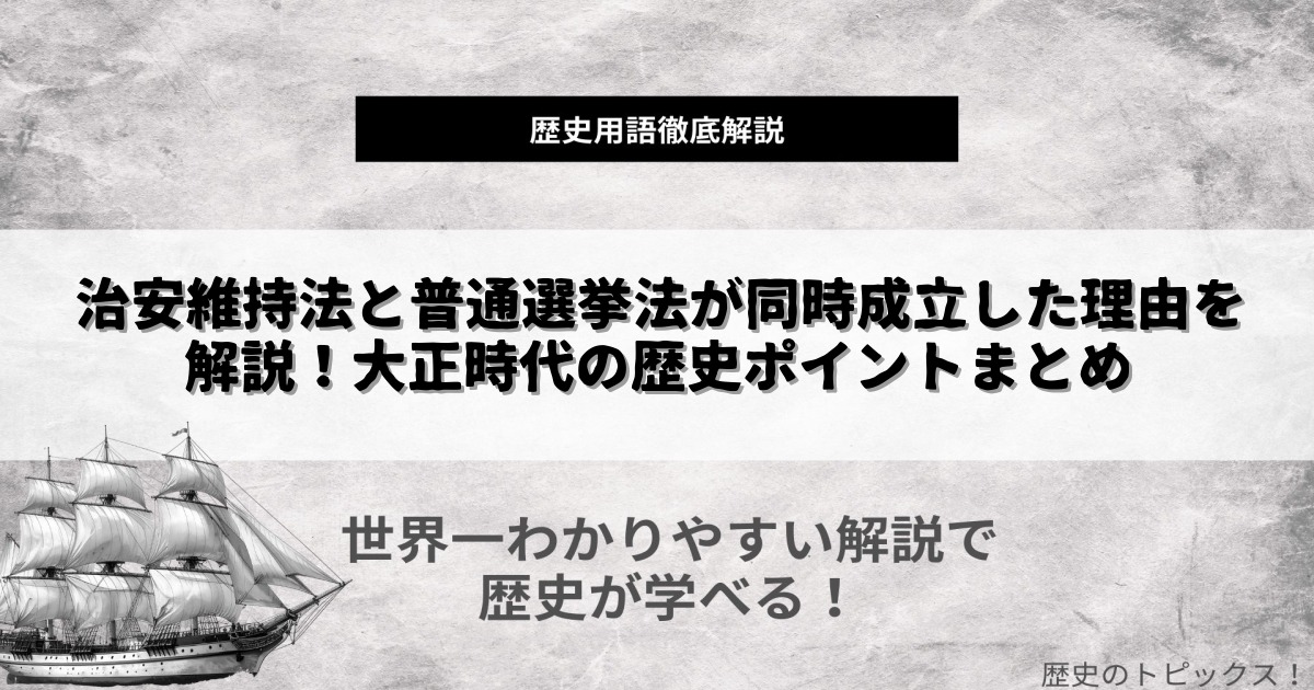1925年、大正時代の日本で「治安維持法」と「普通選挙法」が同時に成立しました。なぜこの2つの法律が同じ年に制定されたのでしょうか?この記事では、治安維持法と普通選挙法が同時に生まれた背景やその理由を、分かりやすく解説します。社会の動きや時代の流れをおさえながら、中学歴史の学び直しや受験対策にも役立つ内容を盛り込みました。ぜひ最後までお読みください。