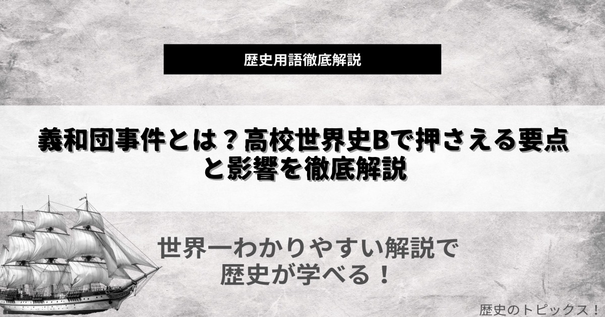 19世紀末、列強諸国の進出によって中国は大きく揺れ動きました。その中心にあったのが義和団事件です。本記事では、義和団事件の発生背景や経過、そしてその後の中国や世界への影響まで、わかりやすく丁寧に解説します。高校世界史Bの学習や大人の学び直しにも最適な内容になっています。中国近代史の重要キーワード「義和団事件」をしっかり理解しましょう。