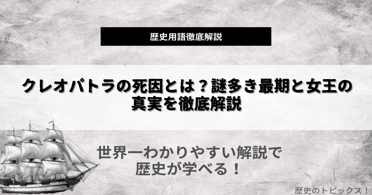 クレオパトラの死因は、古代エジプト史でも最も有名な謎のひとつです。美貌と知性でローマ世界を翻弄した女王クレオパトラ7世は、なぜ、どのようにしてこの世を去ったのでしょうか。