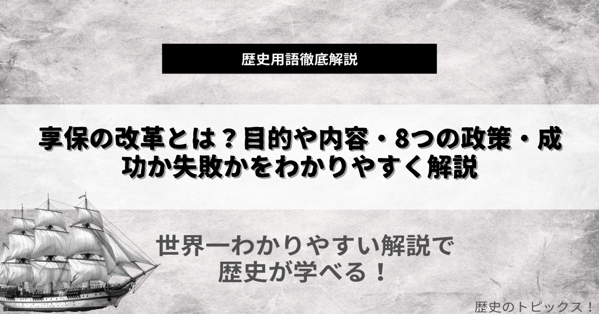 江戸時代の三大改革のひとつとして、歴史の教科書にも必ず登場する「享保の改革」。財政難の幕府を救うため、8代将軍・徳川吉宗が断行した一大改革です。その目的や具体的な政策、どのような結果をもたらしたのか、年表や覚え方も交えて詳しく解説します。... -